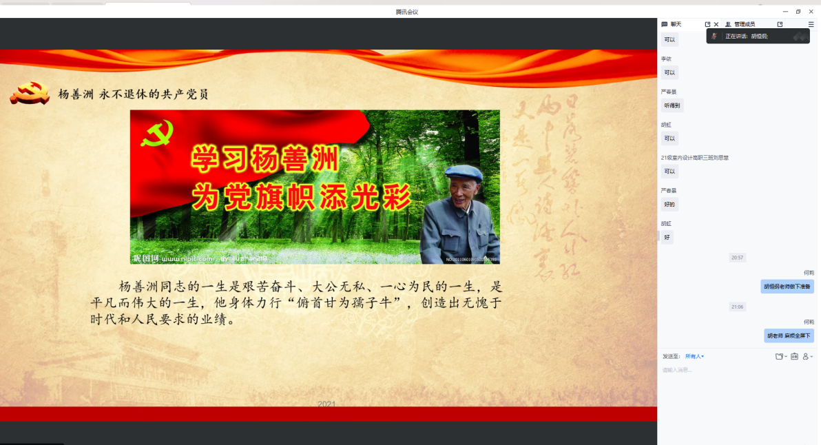 7月27日晚艺术设计系党支部在腾讯会议,开展了微型党课学习活动。党课学习主要由支部党员蒋丽萍、胡恒纲二名同志主讲。