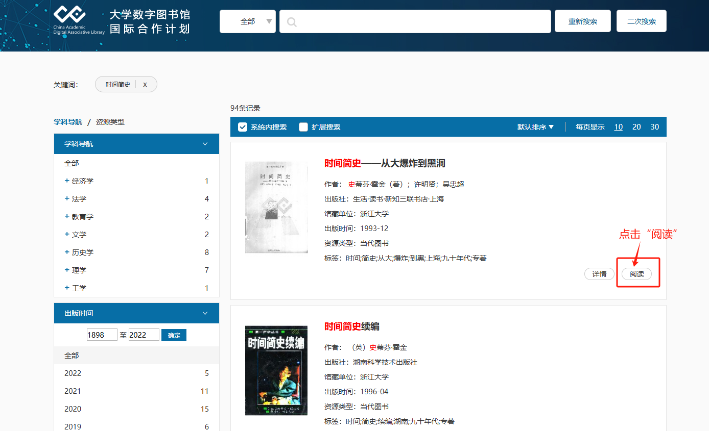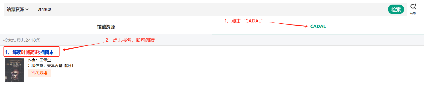 2、在检索框内输入所查找的书目(以时间简史为例),点击检索可得馆藏资源和CADAL相关资源,点击“CADAL”。选择自己想阅读的图书,点击书名即可阅读。