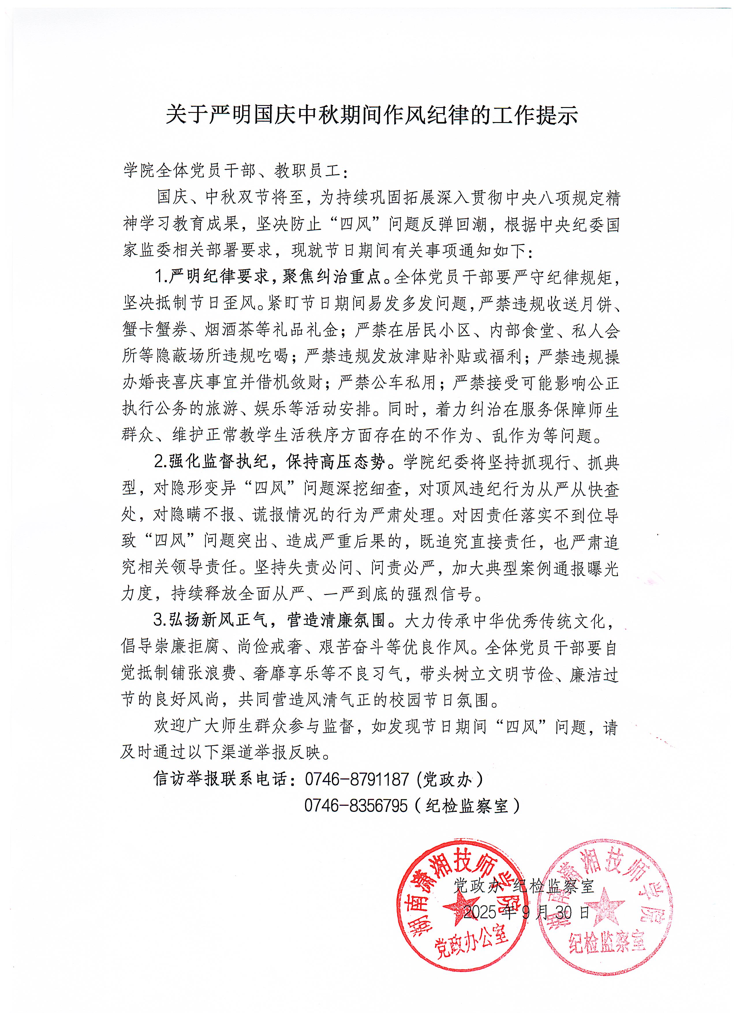关于严明国庆中秋期间作风纪律的工作提示