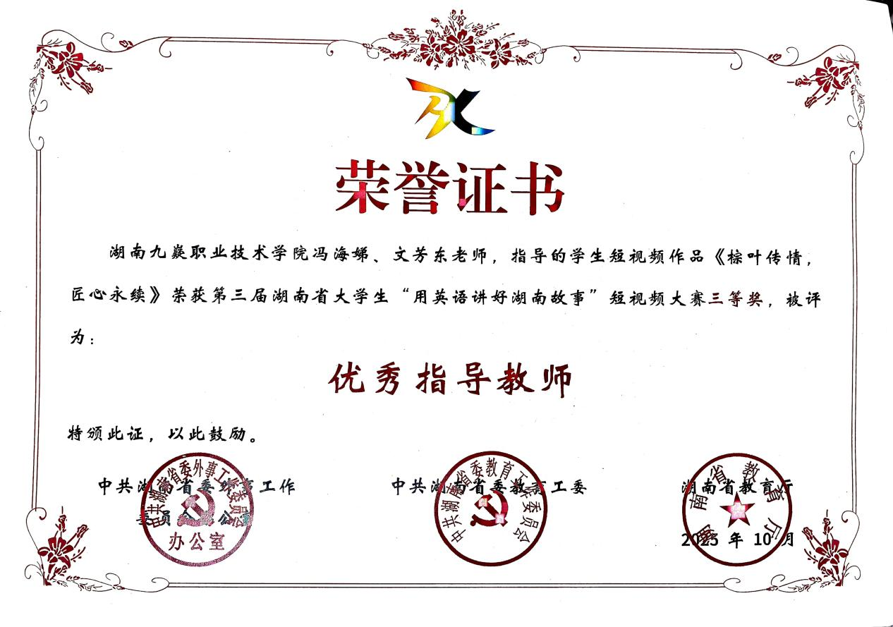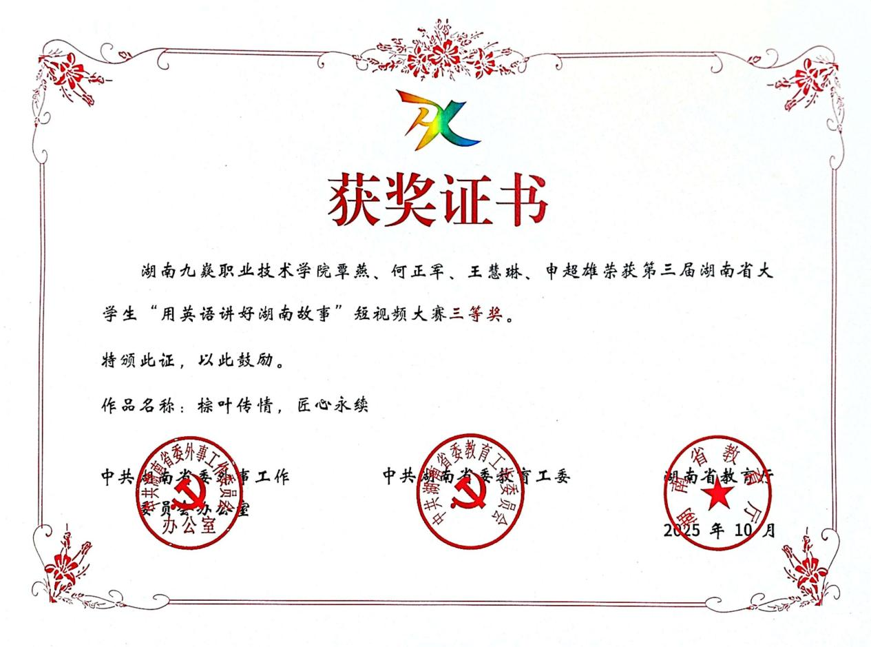 2025年10月31日,由中共湖南省委外事工作委员会、省委教育工作委员会及省教育厅联合主办的第三届湖南省大学生“用英语讲好湖南故事”短视频大赛圆满落幕。我系教师冯海娣、文芳东指导的学生团队作品《棕叶传情 匠心永续》凭借独特视角与生动叙事,从全省高校参赛作品中脱颖而出,荣获省级三等奖。同时,指导老师获评“优秀指导老师”。